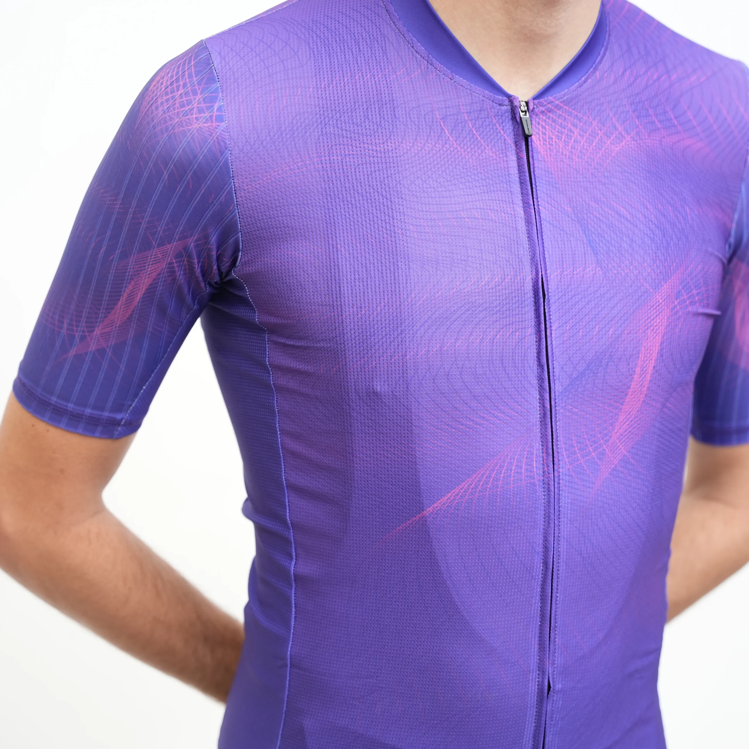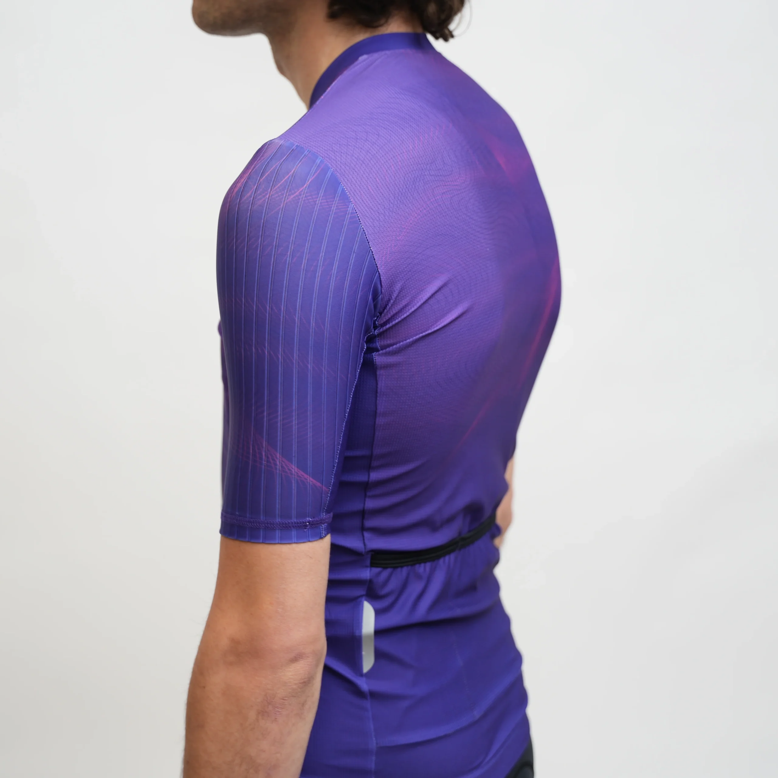 We took a winning design and gave it a facelift. The sleeves on the Airspeed II are set in meaning the panel doesn’t go all the way to the collar. This improves fit, comfort, and aesthetics. We took the aerodynamic ridged fabric from the original design but removed the power band at the arm opening to reduce compression.